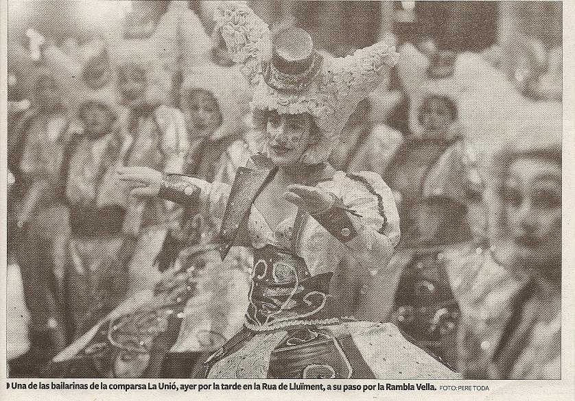 "Una de las bailarinas de la comparsa La Unió, ayer por la tarde en la Rua de Lluïment, a su paso por la Rambla Vella"