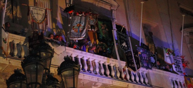 Rebuda del rei Carnestoltes a càrreg de Nou Ritme i reina Concubina a càrreg de Colours Fantasy de Tarragona 2013 amb el penó de la Comparsa. |